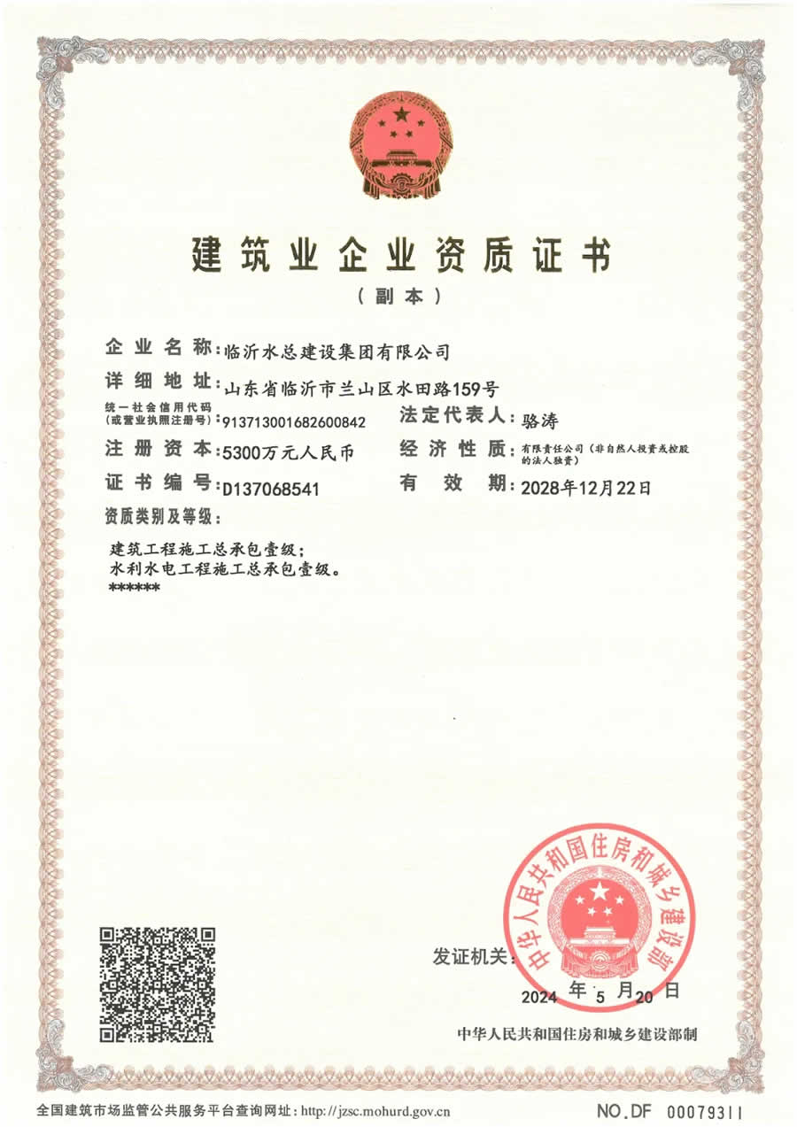 臨沂水總建設(shè)集團(tuán)有限公司(原山東臨沂水利工程總公司,于2023年9月完成改制更名)成立于1959年,隸屬臨沂市水利集團(tuán)有限公司,是涵蓋水利工程施工、房屋建筑工程施工、公路橋梁工程施工、市政公用工程施工、水利工程監(jiān)理于一體的綜合性企業(yè)。